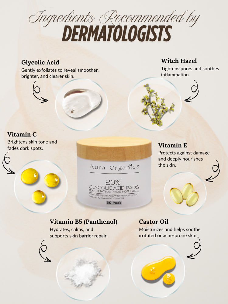 These exfoliating pads are infused with 20% glycolic acid to gently resurface the skin, unclog pores, and reduce the appearance of fine lines and dark spots. Enriched with witch hazel, vitamins C, E, and B5, and castor oil, they brighten and hydrate while promoting a smoother, clearer complexion.